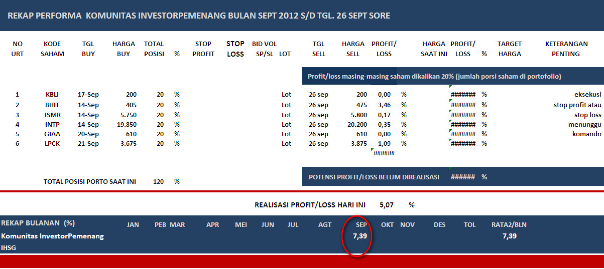 Komunitas InvestorPemenang bebas dari goncangan B-9 dan GTBO dan telah merealisasi REAL PROFIT portofolio bulan September sebesar 7,38 % untuk MODAL menangkap PELUANG BARU di DEPAN. Ini adalah REAL PROFIT PORTO yang sebenarnya, karena PROFIT/LOSS setiap saham di bagi sesuai dengan porsinya di portofolio secara keseluruhan.