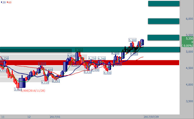 Wilayah konsolidasi saham jsmr dilihat dari peta besar ada di batasan tangga 500. Artinya setelah 5000 resist berikutnya adalah 5500, 6000, 6500 dst, dengan potensi pullback di setiap wilayah konsolidasi 50% dari tangga resist 500 yaitu sekitar 250 point